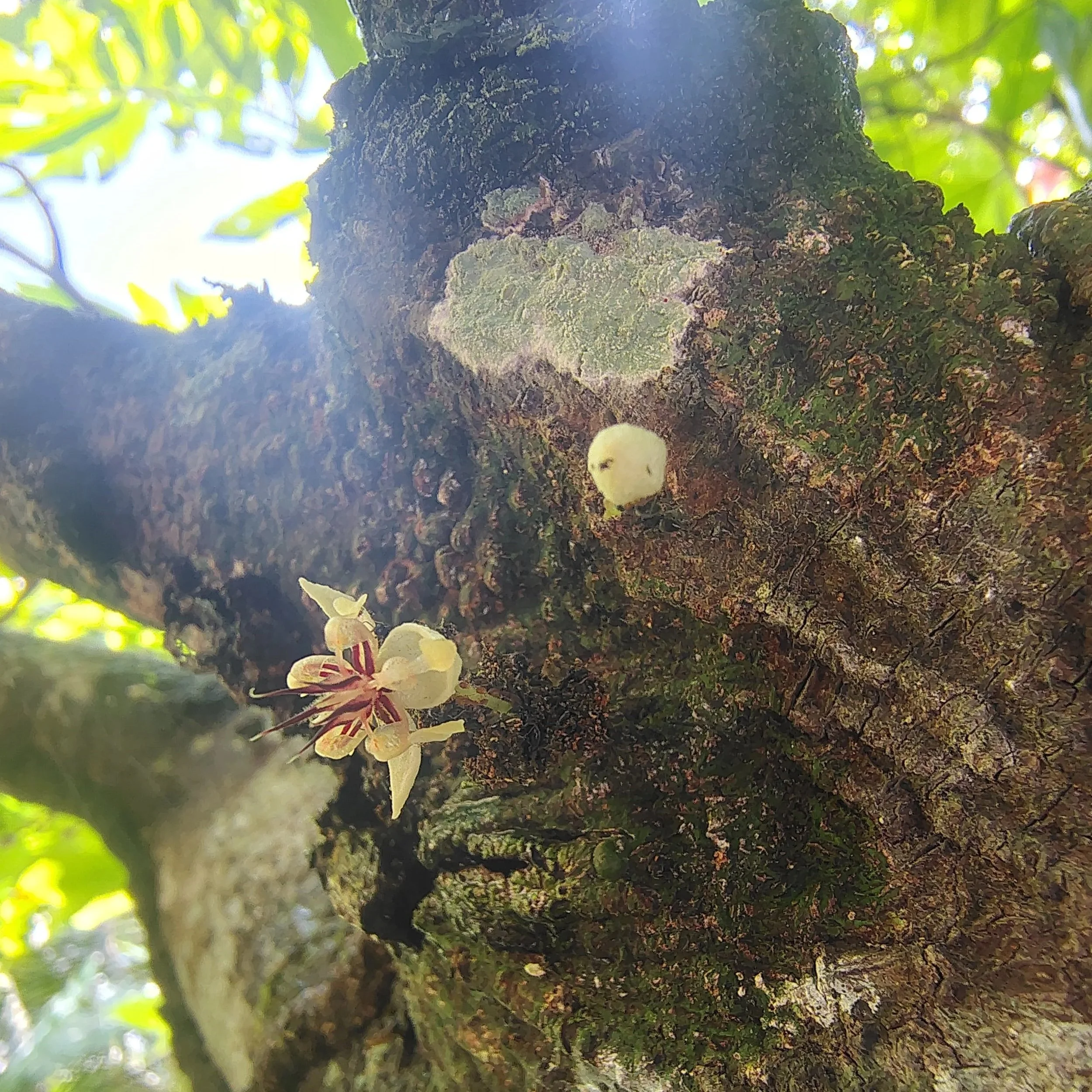 A small flower of Theobroma cacao along the trunk of the tree in bloom with another bud unopened.